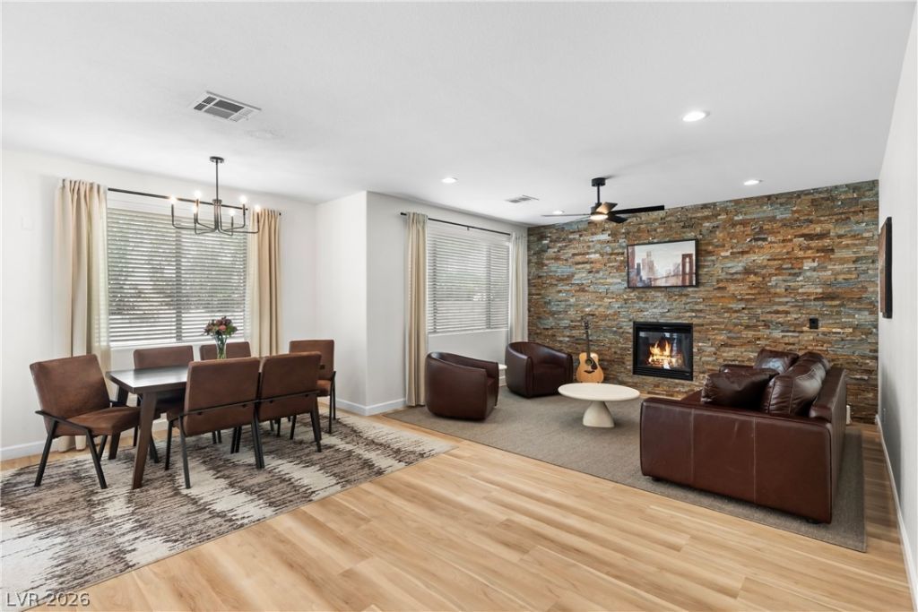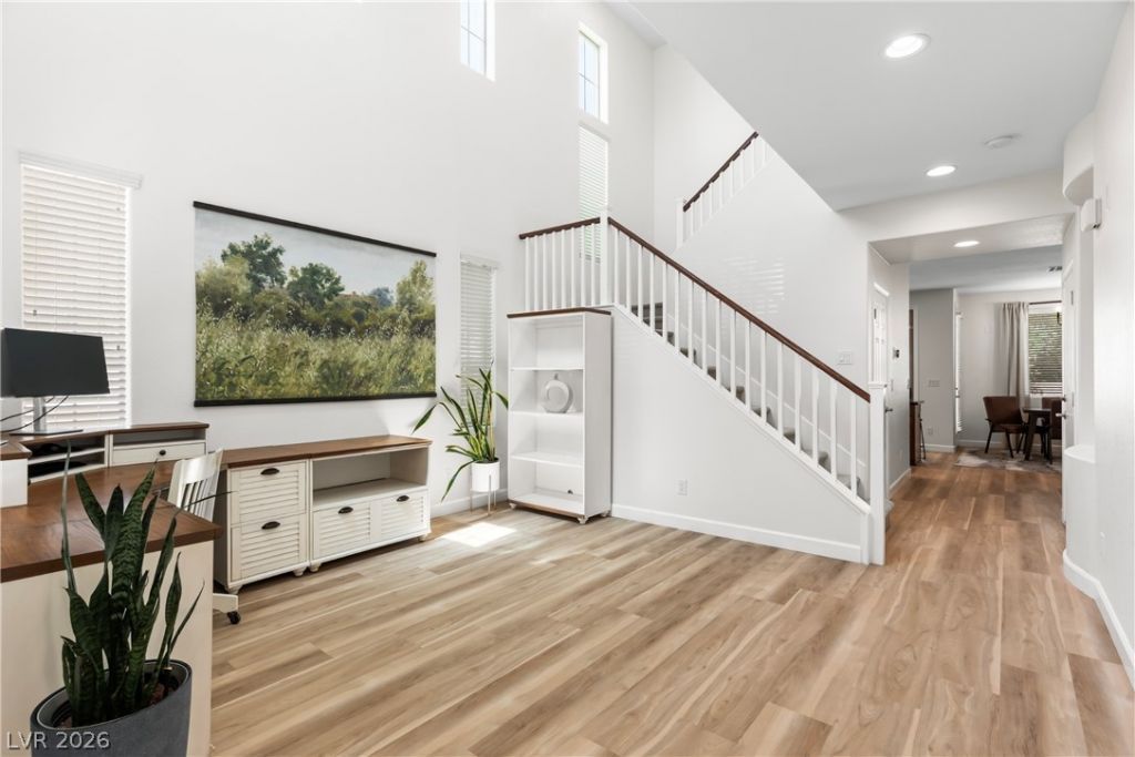 LIGHT, BRIGHT AND AIRY HOME IN THE HEART OF SUMMERLIN! This two-story home has been stylishly updated and is move-in ready. Luxury vinyl plank flooring flows throughout the main level. The entryway opens up to the formal living room which features a soaring ceiling and an abundance of natural light. The heart of the home is an open-concept kitchen displaying granite countertops, an island with seating, rich wood cabinetry with new cabinet pulls and an open dining area with new light fixture. Upstairs, the primary suite offers a private retreat with a spa-like bathroom and its own balcony. Outside, the lush, private backyard is perfect for entertaining or relaxing. Additional highlights include large secondary bedrooms with shared hall bath, open loft for an additional living or office area and separate laundry room with new washer and dryer. Situated in a prime location, with easy access to major freeways, shopping, top-rated schools, parks and all that Summerlin has to offer!